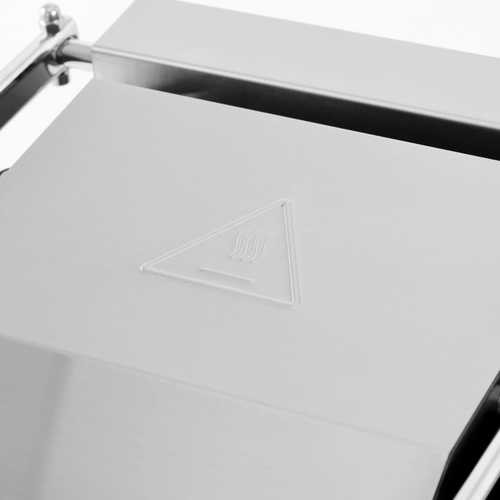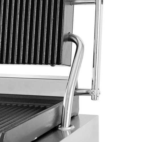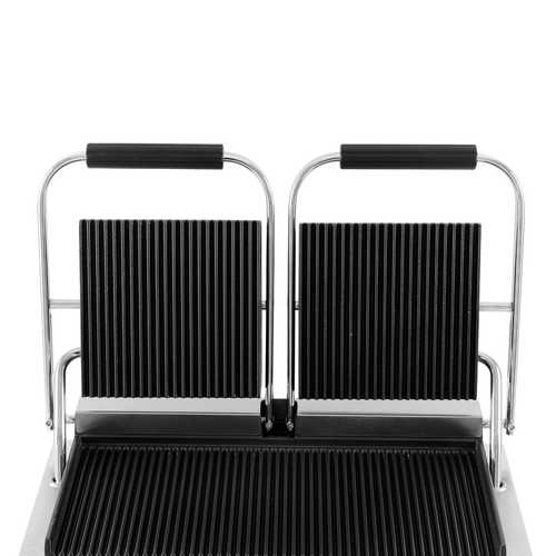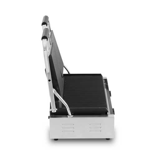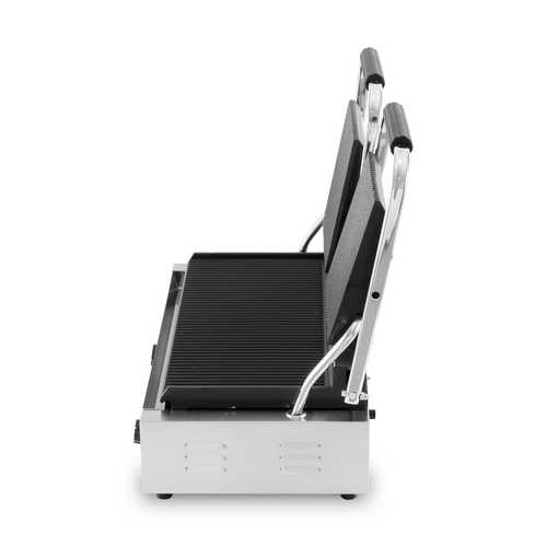 טוסטר לחיצה תעשייתי כפול PRO-LINE חזק במיוחד, מיועד לשימוש מסחרי. מצויד בפלטות צליה מברזל יצוק פלטה תחתונה שטוחה & פלטות עליונות מחורצות מגיע לטמפרטורה גבוה