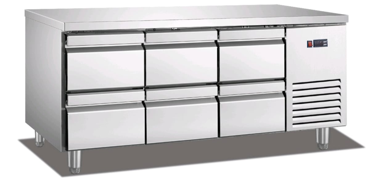 מקרר דלפק נירוסטה איכותי ואמין מבית NESLINE עם משטח עבודה עליון ומערכת קירור אוויר.