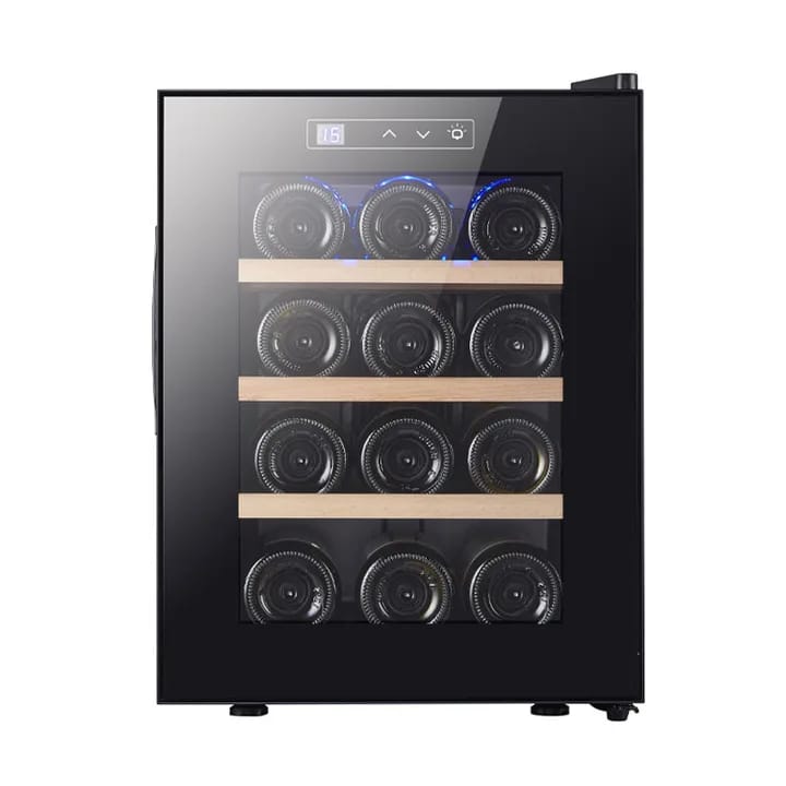 מקרר יין עבור 12 בקבוקים בנפח 33 ליטר מקרר בעל עיצווב אלגנטי ומוקפד, מידות: 345/490/470 מ"מ, למקרר תאורת LED ומסך בקרה טאצ', טמפ' 11-18 מעלות