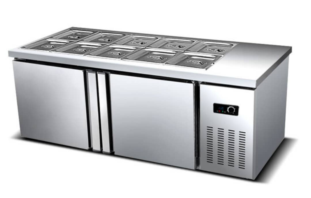 מקרר סלטייה ריצפתית משולב + מקרר תחתון 2 דלתות, חלק עליון סלטייה ל- 8 גסטרונום 1/4, מידה: 1800X700X800 מ"מ, קיבולת: 300 ליטר, המקרר בעל קירור ישיר, נוזל קירור R134a, טמפרטורה: 0-10 מעלות, הספק: 180W, משקל: 79 ק"ג