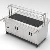 עגלת חימום בן מארי עשויה נירוסטה מתאימה ל-5 גסטרונום 1/1, מידות כלליות: 1800/900/1400 ס”מ, הספק: 1.8KW, טמפ’: 30-85 מעלות , בעלת גלגלים וארון אחסון תחתון