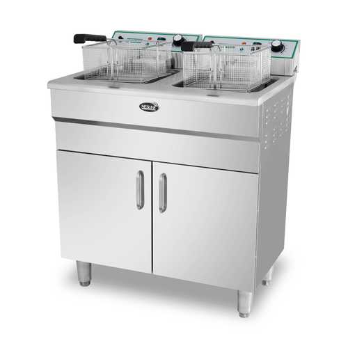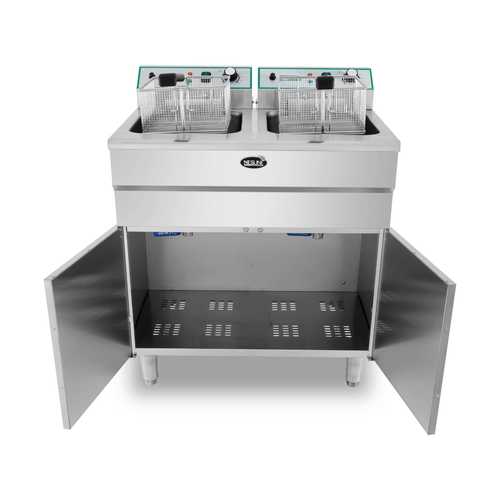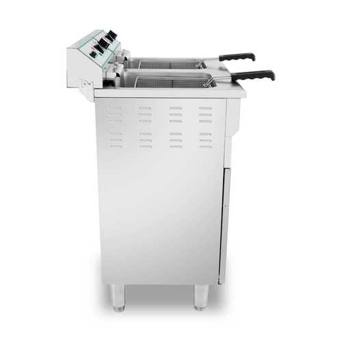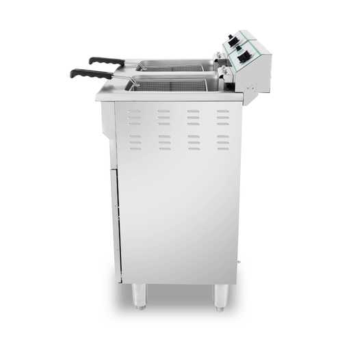 צ'יפסר חשמלי ריצפתי תעשייתי עשוי נירוסטה בנפח של 28 ליטר, בעל 2 סלסלאות, תא איחסון תחתון, מידות: 400X800X1125 מ"מ, הספק: 9KW, משקל: 35 ק"ג