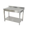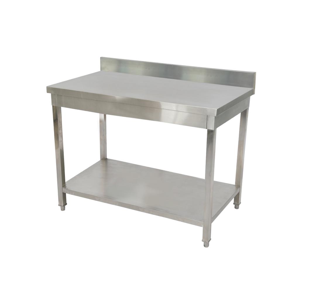 שולחן עבודה נירוסטה עם מדף תחתון, כולל הגבהה מאחור עם מדף ורגליים מתכווננות.